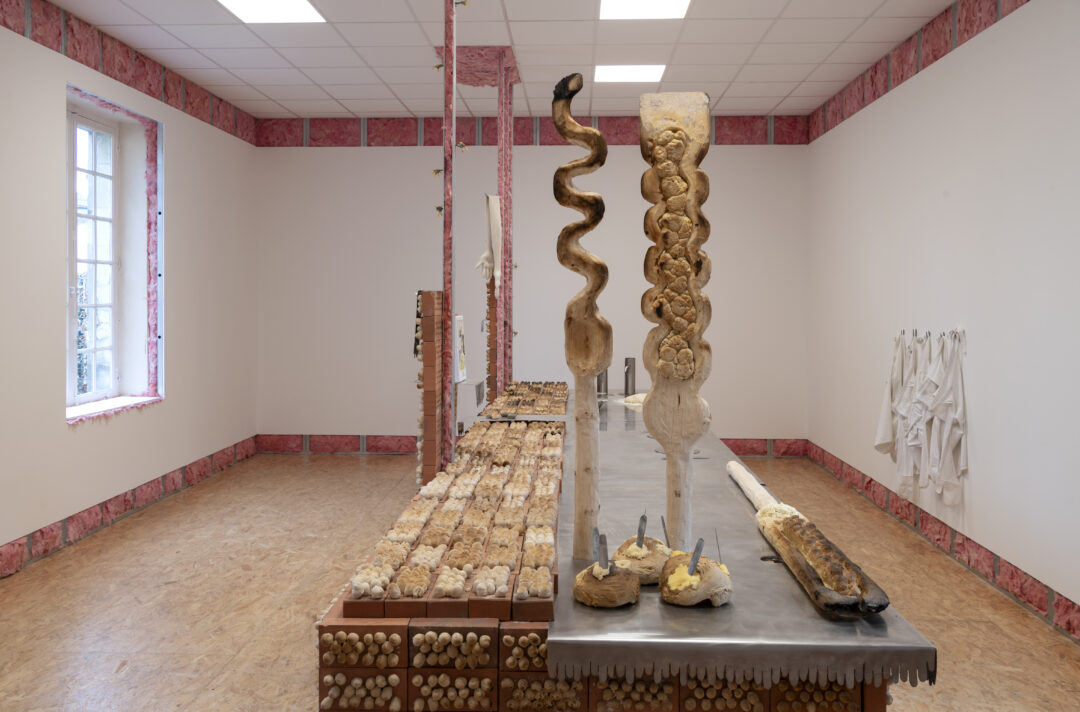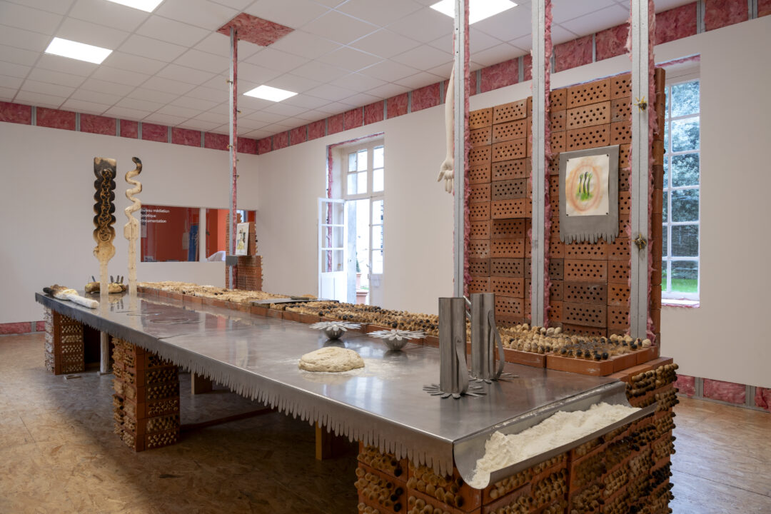 Pour son exposition, l’artiste a imaginé un dispositif architectural participatif. L’îlot central, qui occupe le centre de la salle d’exposition, s’apparente à un laboratoire culinaire. Tel un décor de pizzéria, il est constitué d’une façade en briques creuses aux boursoufflures, créées par la cuisson dans le four familial, de la pâte à pain incorporée par l’artiste dans les trous des briques. L’agencement de ces modules en fonction de la couleur de la croûte de pain, allant de la plus doré à la plus brûlée, constitue un pan coloré au dégradé élégant. En contraste, de l’autre côté de ce mur factice, nous découvrons un plan de travail en inox avec deux plaques de cuisson à induction qui seront utilisées, entre autres, par des groupes scolaires invités à fabriquer du pain et le cuire. Sont également disposés des ustensiles de cuisine créés par l’artiste : couteaux gravés en forme de doigts, pichets, culs de poule, mais aussi des sculptures en pain fourrées de beurre aromatisé. Exhibées en majesté, plantées verticalement à l’une des extrémités du plateau, deux formes sculpturales en bois brut filiformes taillées par l’artiste se terminent par une spatule évidée partiellement carbonisée. Clélia Berthier les détourne de leur fonction de pelles à défourner pour cuire la pâte à pain qu’elle y a insérée. Sortis du four, les pains qui ont pris des formes aléatoires pourront être extraits des pelles, puis beurrés et dégustés par les spectateur·rices.