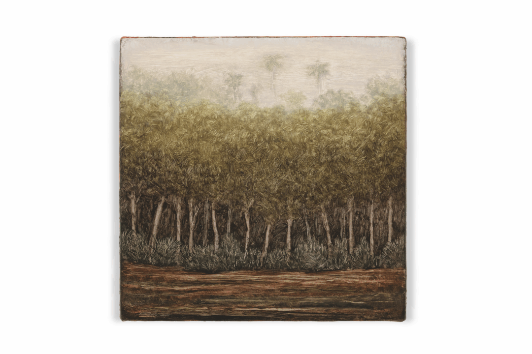 In Norman Foster’s sleek architecture, hung very sparingly, with sometimes only one painting per picture rail, the whole acquires a minimalist dimension, and in many ways, one might think one was discovering the spiritual heir of Robert Ryman. The paintings are not all white, far from it, but there are still a number of them, and those that are coloured are done so in pastel or faded colours. It should also be said that, inspired by seashores, gardens and forests, these paintings convey the humidity, mists and atmospheric heat of the tropical landscapes that the artist encounters. Another point to note is that he does not paint from life, but in his studio, from memory; details fade away in favour of memories of sensations and reconstructions by the imagination. Take, for example, the seascapes he has been painting since the early 2010s: with similar compositions, a slightly agitated sky in shades of beige or grey, or dark in the case of nocturnes, occupying most of the time more than three-quarters of the pictorial surface, a sea reduced to a thin horizontal strip without waves, echoed below by another thin strip for the shore, the canvases are on the borderline between figuration and abstraction. No clouds stand out, no waves animate the water, no living beings walk about; everything has been removed to retain only the bare minimum. From a material point of view, the same is true: in the layer of paint, we can see the gestures that have removed the surplus to retain only the essential. More precisely, the paintings are covered with encaustic and then scraped, on a background previously painted in a carefully chosen colour that reappears through transparency and, above all, appears at the edges of the surface, like a frame. For example, the paintings devoted to the rainforest have a dark background that disturbs their luminosity and reveals this manufacturing secret right at the edge. This way of leaving a barely visible border at the corner of the frame fully inscribes Arruda’s work in contemporary painting.