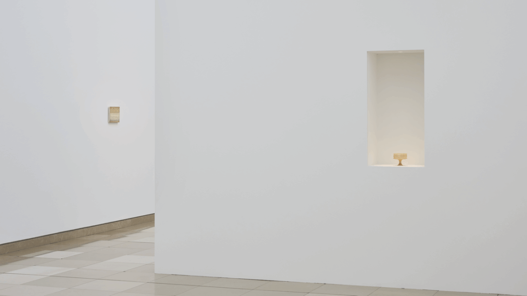 The impression of a work that is not only contemplative and timeless, but also contributes to a reflection on the different media of images today – according to the distinction emphasised by W. J. T. Mitchell between image and picture[2] – is confirmed by the presence of pieces using media other than painting. Firstly, a small alabaster vase, commissioned by the artist from a craftsman based on an archaeological model, displayed in the middle of the paintings, is a plea for the beauty of the material, its nuances and its ability to capture light. Further on, a slide show presented in a completely darkened space, with only two large armchairs in which to sink comfortably, presents us with the dark side of the small, soothing paintings. Composed of 81 slides painted, hatched, even scribbled with agitation on the plastic material of the film, it strikes us like a storm that has been brewing and has finally broken. Its title, Three Days and Three Nights from the Deserto-Modelo Series (2023), clearly indicates that it is linked to the series, as a supplement, clarification, or focus, in the manner of a spin-off. Then, an installation on the scale of an entire room pushes the exploration of luminous painting to its radical extreme. On the walls are diptychs composed of a rectangle painted in white, very slightly tinted with colour, and another rectangle formed purely and simply by a projection of white light. You have to stay in the room for a while to clearly perceive all their contours – an experience that makes you want to go back and observe the nuances of whites and colours in the small paintings.