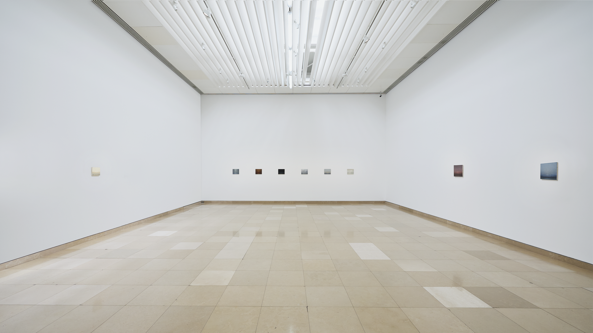 The impression of a work that is not only contemplative and timeless, but also contributes to a reflection on the different media of images today – according to the distinction emphasised by W. J. T. Mitchell between image and picture[2] – is confirmed by the presence of pieces using media other than painting. Firstly, a small alabaster vase, commissioned by the artist from a craftsman based on an archaeological model, displayed in the middle of the paintings, is a plea for the beauty of the material, its nuances and its ability to capture light. Further on, a slide show presented in a completely darkened space, with only two large armchairs in which to sink comfortably, presents us with the dark side of the small, soothing paintings. Composed of 81 slides painted, hatched, even scribbled with agitation on the plastic material of the film, it strikes us like a storm that has been brewing and has finally broken. Its title, Three Days and Three Nights from the Deserto-Modelo Series (2023), clearly indicates that it is linked to the series, as a supplement, clarification, or focus, in the manner of a spin-off. Then, an installation on the scale of an entire room pushes the exploration of luminous painting to its radical extreme. On the walls are diptychs composed of a rectangle painted in white, very slightly tinted with colour, and another rectangle formed purely and simply by a projection of white light. You have to stay in the room for a while to clearly perceive all their contours – an experience that makes you want to go back and observe the nuances of whites and colours in the small paintings.