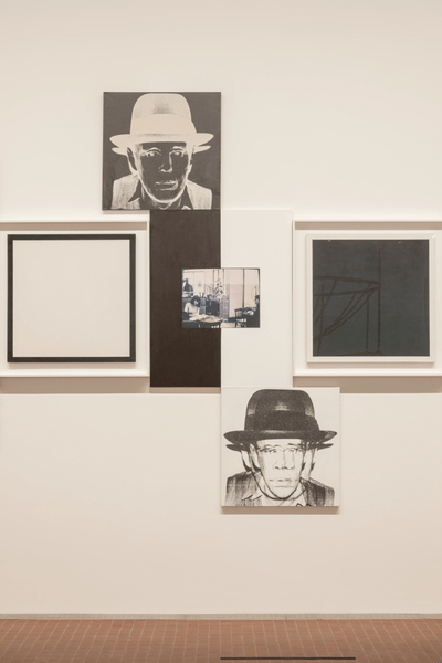 Especially so at the end, where two monochrome paintings by Ellsworth Kelly (White and Black squares) are paired in a cross-shaped arrangement with two of Andy Warhol’s monochrome portraits of Joseph Beuys—one double-exposed, the other in negative. The group connects through Ian Wallace’s yin-yang-inflected Masculin/Féminin (The Café Scene). It’s refreshing to witness, for sometimes a cigar is just a cigar. (1)
