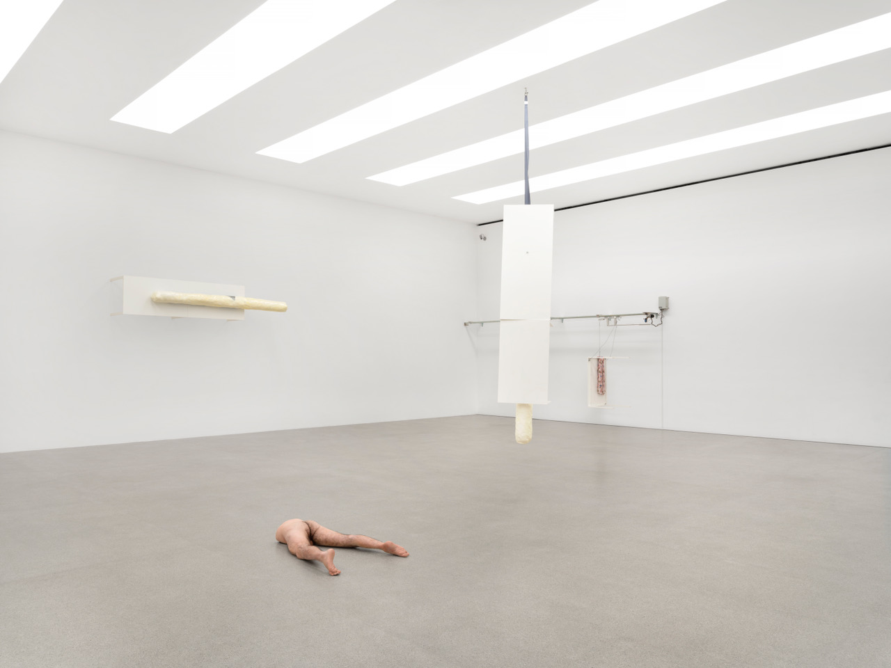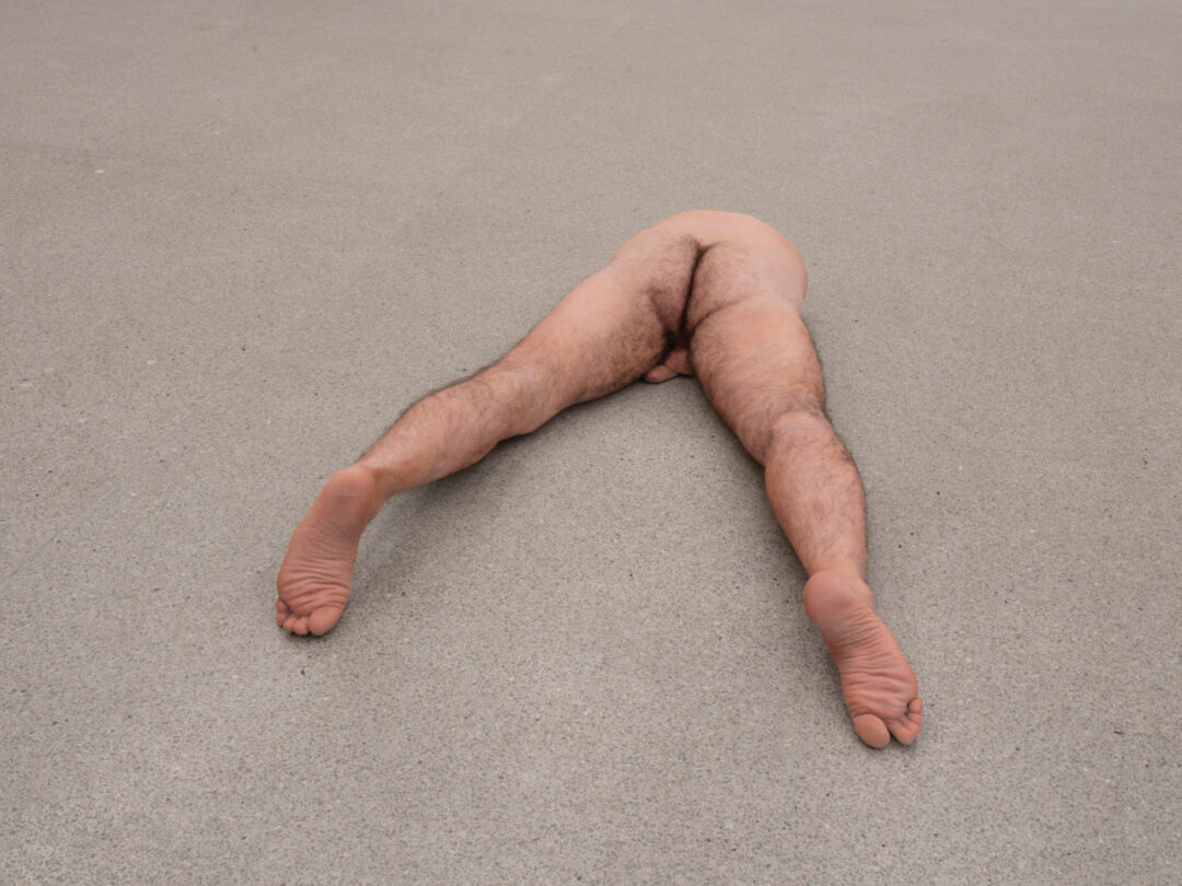 Au centre d’art Pasquart, l’artiste a imaginé une « dramaturgie », selon ses termes, qui anime l’immense cube blanc clinique : une machinerie spectaculaire mais minimale. C’est une sculpture hyperréaliste au sol qui en était le pivot : un demi-corps inférieur, rose et velu qui, dès l’entrée, capte le regard, et leste l’espace de tout son poids, diffusant une énergie paradoxale. Les parties génitales sont plaquées au sol, encastrées dans son cul, une photo de gays texans, sous-titre littéral d’un homoérotisme, qu’on imagine underground au Texas. Son jumeau, lui, inachevé, imberbe et cadavérique, gisant dans la même position sur une table, semble défait, suggestivement. Ces visions sont à la fois effrayantes et cocasses.