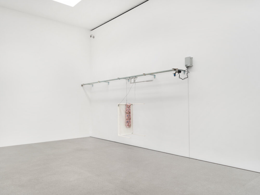Le titre de l’exposition de Pasquart « Daddy is Home » est une phrase factuelle mais certainement pas anodine, s’agissant du père. En l’occurrence, elle fait écho à un événement politique pour le moins important : elle est devenue un slogan viral ovationnant la réélection du président des États-Unis – le père de la horde primitive. Ici, l’ère des pères se termine, là-bas, elle resurgit. Un père, version pauvre, mannequin rudimentaire et mal fagoté, bande et bat sa coulpe, une cuillère au niveau du sexe se lève et se baisse (What’s the plan?, 2025). Elvira (2025) produit en écho le bruit de va-et-vient d’une table Ikea sur un rail, où pend un tissu féminin vieillot : réminiscence du personnage transgenre du film L’Année des treize lunes (1978), de Rainer Werner Fassbinder, en quête de son passé.