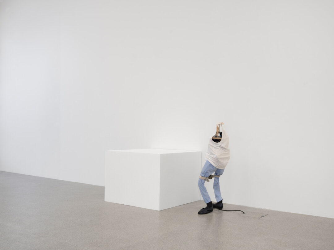 Le corps est partout chez Quillacq, mais n’apparaît guère dans son intégrité. Il est tronqué et fragmentaire ou bien masqué : acéphale. Ce qui frappe d’emblée dans ses expositions, ce sont les morceaux de corps, toujours des parties inférieures, celles, donc, sans fonction de préhension et sans prise sur la réalité. Quillacq affiche une fascination à l’égard des choses d’en bas, et fait de cette zone de haute tension le centre de gravité de sa pratique de sculpture et de performance.