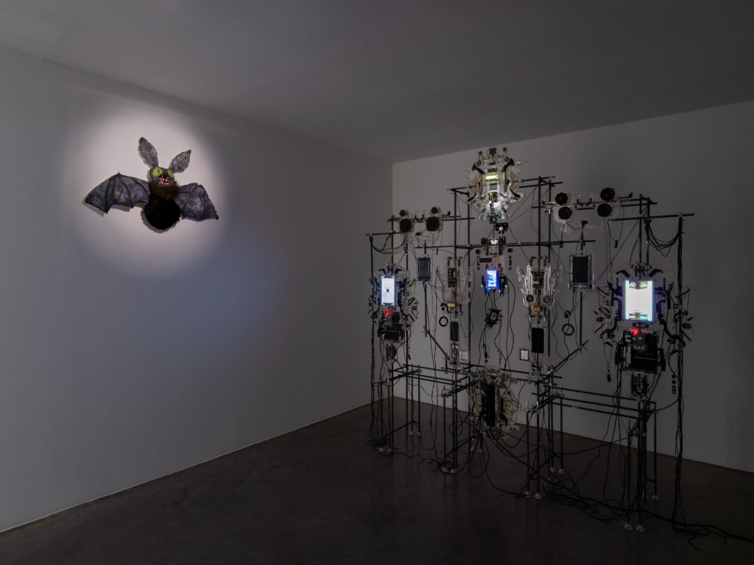 C.A. : Vous avez choisi de structurer l’exposition en deux volets, « Berserk », le plus sombre, au Plateau, et « Pyrrhia », davantage lié à l’enchantement, aux Réserves à Romainville. Pyrrhia, c’est le nom d’un papillon mangeur de bois, connu sous l’appellation « chrysographe », dont on affuble également les moines enlumineurs. C’est aussi le nom d’une île imaginaire dans le cycle fantastique Les Royaumes de feu de Tui T. Sutherland, à l’intérieur duquel la focale est mise sur les aventures des dragons qui peuplent l’île plutôt que sur les humains, pourtant présents sur le site, mais relégués au rang de personnages secondaires, voire d’éléments de décor. On retrouve ici le décentrement que l’on évoquait précédemment, mais dans une version enchantée, où le merveilleux l’emporte largement sur les dimensions inquiétantes ou sombres qui, elles, prédominent côté « Berserk ». Ce partage a produit sur moi l’impression d’un antagonisme nécessaire : non pas deux modalités distinctes, mais plutôt un premier moment sombre en résonance avec les angoisses contemporaines, et un second moment, corrélat du premier, que l’on invente comme un antidote à celui-ci, un sauve-conduit ou un espace utopique de résistance, qui s’espère performatif. L’imaginaire de l’apocalypse, si prégnant aujourd’hui, n’est soutenable que par le truchement de fictions enchantées – fictions qui appellent leur actualisation dans le monde. Dès lors, on a le sentiment qu’eschatologie et fantaisie forment un couple polaire, caractéristique de notre époque. La fantaisie, le merveilleux pourraient-ils être envisagés comme le remède esthétique et politique à l’horizon glaçant des crises écologiques et militaires ? Par ailleurs, Les Royaumes de feu sont avant tout une œuvre destinée à la jeunesse, quelle place occupe l’enfance, et sa puissance enchanteresse, dans ce second épisode de l’exposition ?