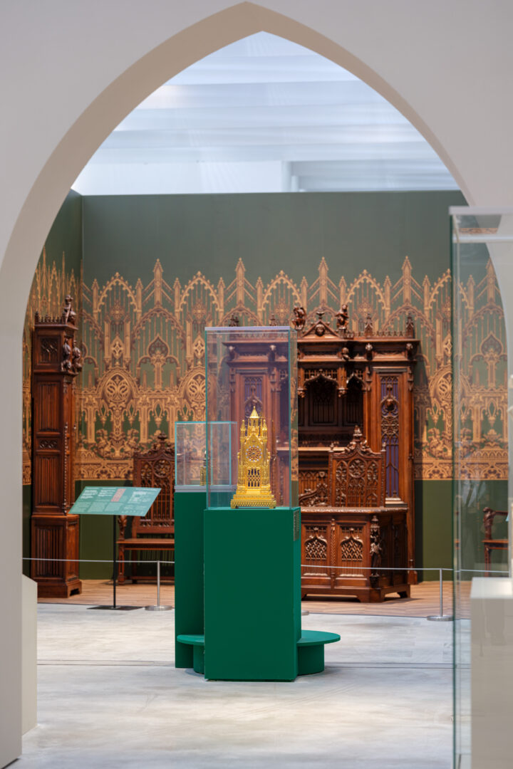 La scénographie de l’exposition est pensée pour immerger les visiteur·ices dans l’univers qu’on associe au gothique le plus traditionnel. Le parcours reprend le plan d’une cathédrale, avec le chœur en point de bascule à mi-chemin et des séries d’arcs brisés qui séparent les espaces. L’évolution des couleurs des murs, allant des nuances de gris vers des teintes plus variées, accompagne les différentes parties de l’exposition, comme un clin d’œil aux variations associées au genre. Deux period rooms complètent la visite : un bureau néogothique du xixe siècle conservé dans son intégralité et une chambre contemporaine, à la décoration et aux objets culturels goths, recréée par deux représentantes locales de la culture gothique, Christine et Thérèse Lipinski, qui par ailleurs font partie de l’équipe du Louvre-Lens.
