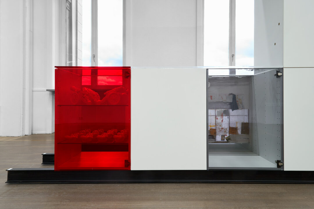 « Hot Flashes » s’intéresse à l’enfance comme le moment au cours duquel l’individu est façonné par des normes éducatives, familiales et politiques. Aline Bouvy, qui a grandi au Luxembourg, fait du Casino un espace idéal pour cette réflexion, comme un « terrain de jeu artistique » qui cache une vision du monde « urgente, brûlante ». Ses œuvres, à l’image des hamburgers géants abritant des scènes miniatures sur la société de consommation, ou l’installation « La Fame », pensée comme une « cuisine hallucinée », revisitent l’espace domestique et les diktats patriarcaux. Ces pièces, bien que préexistantes pour certaines, s’intègrent dans un dialogue cohérent avec les créations inédites conçues pour l’exposition. La force de cette approche pluridisciplinaire est de faire de l’exposition elle-même son terrain d’expérimentation. La scénographie, pensée comme un parc d’attractions revisité, joue sur les effets d’échelle et de perspective. Les murs monochromes du Casino, contrastant avec la fresque colorée et les reflets du miroir sans tain, créent une tension entre immersion et malaise. La monochromie partielle, qui évoque la « neutralité » problématique du blanc dans d’autres expositions de l’artiste comme « Le Prix du ticket4 », est ici moins marquée, au profit d’une palette plus ludique. Ce choix, bien que cohérent, représente peut-être une trop grande concession à l’accessibilité, au détriment d’une radicalité formelle.