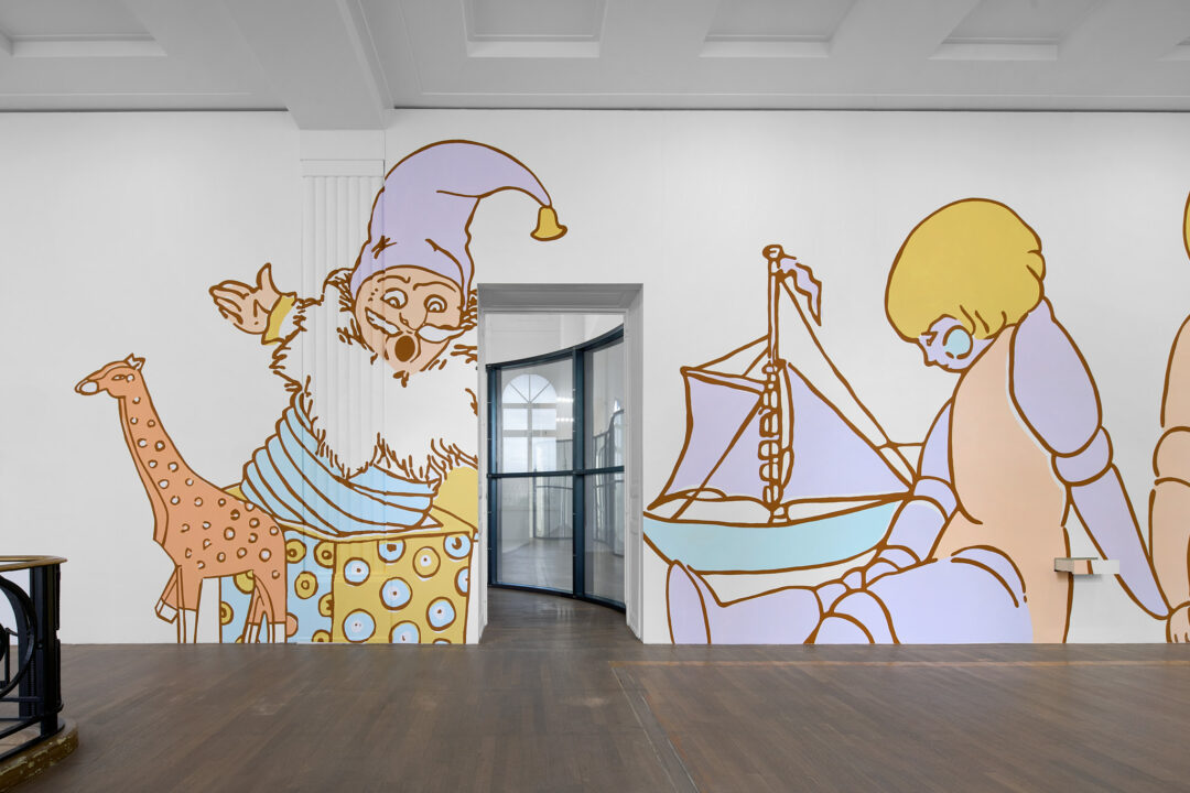 « Hot flashes » s’ouvre au premier étage de l’institution sur une fresque monumentale intitulée « The same room (After Julie Becker) », inspirée des travaux de l’artiste américaine Julie Becker (1972-2016) et des parcs d’attractions, qui donne d’emblée le ton. Peuplée de poupées, ballerines d’écrins à bijoux et diables en boîte, l’œuvre, peinte in situ avec une liberté assumée, évoque les motifs colorés des chambres d’enfants des années soixante-dix, mais à une échelle démesurée qui perturbe l’ordinaire au point de devenir inquiétant. Aline Bouvy, qui revendique ici un retour au geste pictural, transforme ces figures en un « monde psychologique parallèle » aux accents macabres, dit-elle. En s’inspirant de l’ouvrage « No Future2 » de Lee Edelman, elle envisage l’enfance non pas comme un espace d’innocence, mais comme une construction sociale traversée par des tensions politiques et culturelles. Geste inaugural fort, cette fresque convoque la nostalgie pour mieux la détourner afin de révéler les conditionnements enfouis dans les objets du quotidien. La pratique de l’artiste questionne les constructions sociales qui nous cloisonnent, nous brident en faisant société.