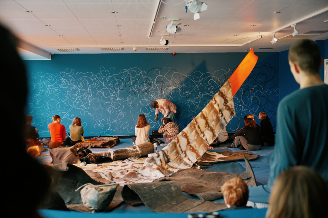 Le processus de cette édition a débuté en 2023, avec des parcours croisés à la BAS qui sont autant d’ateliers nomades mêlant architecture, écriture et arts visuels, et au sein desquels les participants – artistes, penseurs et activistes –, ont exploré des thèmes tels que le soin partagé, la réflexion post-destruction, les pratiques Sámi2, la résolution inconsciente de problèmes, ou encore l’urbanisme et les pratiques artistiques qui récupèrent les ruines. Ces laboratoires préliminaires, ouverts au public depuis février 2025, transforment la triennale en un processus vivant. Les expositions s’éparpillent dans une dizaine de lieux à Bergen, de l’historique Kunsthall à la galerie indépendante Entrée, du bar-club ROMMET au musée de l’Industrie textile à Salhus que l’on atteint en empruntant le Litterature Boat Epos. Au cœur de cette dispersion géographique, qui fait écho à la topographie fracturée de Bergen, ville d’îlots et de ponts, se déploie une programmation foisonnante. Vernissages collectifs, conférences, rencontres avec les artistes, lectures poétiques, concerts immersifs ou encore performances rituelles, les jours marquant l’ouverture de la manifestation détonnent par leur intensité à la fois festive et introspective. Parmi les moments forts, le collectif Maasai Mbili, groupe d’artistes activistes basé dans le quartier de Kibera à Nairobi, au Kenya, qui interroge les migrations et les savoirs autochtones à travers ses créations, transforme la galerie Entrée en « studio vivant » immersif. Les œuvres graphiques sont disposées partout, sur les murs, empilées au sol, invitant le visiteur à s’en saisir. Le collectif propose ici une cartographie de la ville de Bergen du point de vue de positions marginalisées.