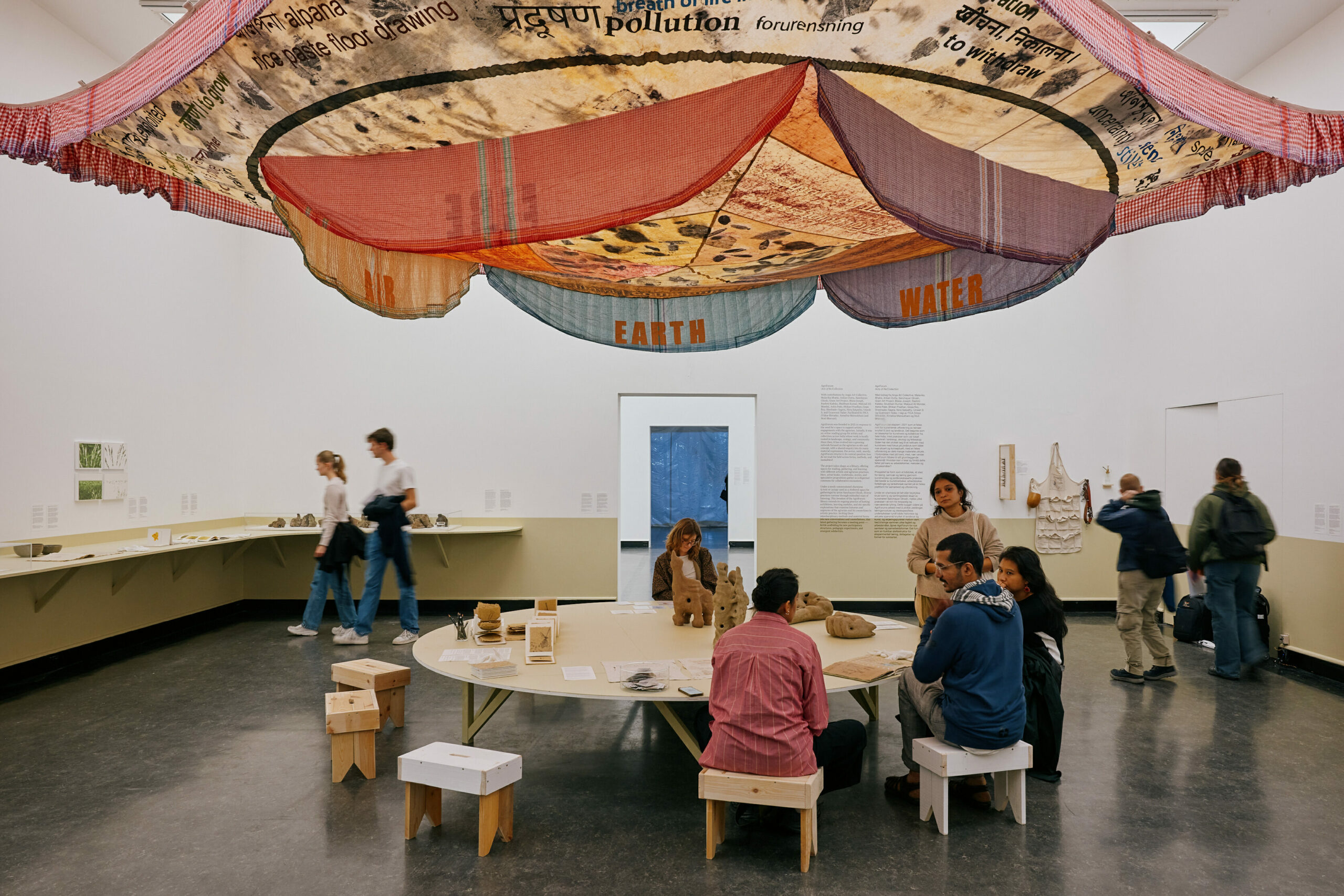 Contribution de Skeivt arkiv, l’archive queer de Bergen, « Archives for Social Change (Archives pour le changement social) » est un projet qui collecte et met en lumière des histoires et des récits liés au changement social. Il réunit cinq archives indépendantes contenant les histoires négligées et souvent réduites au silence de communautés qui se sont battues, se sont organisées et qui, face à l’exclusion et à l’oppression, ont pris soin les unes des autres. L’approche du projet transforme l’archive en un espace vivant de partage et de réflexion collective, invitant le public à explorer des témoignages et des documents qui racontent les luttes et les transformations sociales. Stranges Stiftelse, ancienne maison de pauvreté pour femmes fondée en 1609, sert de cadre à l’exposition, favorisant des échanges intimes et réflexifs. Explorant également des archives de résistance et de mémoire collective, le Communist Museum of Palestine, qui est accueilli par le studio mobile Tenthaus installé devant l’école de la cathédrale de Bergen, incarne un effort continu de remise en question et de réinvention des usages et des formes de l’art, du savoir et de ses institutions, en mettant l’accent sur l’entraide, l’étude partagée et la solidarité. Il présente une exposition d’œuvres données par des artistes solidaires de la Palestine, disséminées dans la ville, chez les habitants et les institutions communautaires, comme un réseau de résistance contre les narrations niant la Nakba. Adania Shibli insuffle ici son empreinte. Ses recherches sur la mémoire palestinienne transforment l’espace en un musée nomade dans lequel l’art n’est pas un objet muséal mais un acte de déliaison des chaînes coloniales. Ravi Agarwal, de son côté, apporte une dimension écologique et industrielle. Ses interventions, visibles avec les installations vidéo des artistes Lapdiang Artimai Syiem et Monica Ursina Jäger, présentées dans ce qu’il reste du couvent médiéval Nonneseter, questionnent les ruines comme sites de soin. Le collectif équatorien Al Borde occupe, quant à lui, l’Open Office de l’Assembly avec des ateliers sur l’architecture communautaire, transformant le bureau de la triennale en cabane collective. Et la BAS, avec son héritage nomade, infuse tout. Ses parcours croisés antérieurs se cristallisent en performances et sculptures qui brouillent les frontières entre apprentissage et création, l’ensemble prenant la forme d’un rhizome. Pas de grand récit curatorial imposé ici, mais des intersections intimes qui vont de l’apprentissage transversal à la parenté au-delà des cultures, et à l’amour comme force disruptive contre les cruautés ambiantes. Parmi le large éventail d’engagements mis en œuvre à travers des expériences d’action collective et des mouvements anticoloniaux se trouve le collectif d’inspiration situationniste Gruppe 66 qui a été l’un des premiers à créer des actions artistiques et des happenings en Norvège. Le Kunsthall lui rend hommage à travers une rétrospective qui inclut une documentation sur les méthodes situationnistes déployées par les artistes du collectif dans les années soixante et soixante-dix, et invite plusieurs artistes (Susan Philipsz, Jakkai Siributr) et collectifs contemporains (Maasai Mbili Artist Collective, Tenthaus Art Collective) à présenter de nouveaux événements de CO-RITUS3 inspirés par le Gruppe 66.