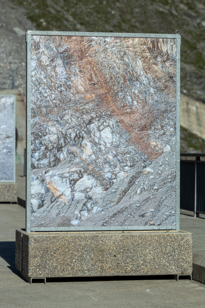 Installé sur le couronnement du barrage de Mauvoisin, dans le canton du Valais, au sud de la Suisse, dans le cadre de la onzième exposition estivale du Musée de Bagnes, et en résonance avec la seconde édition de la Biennale Son, « Glacier noir » de Camille Llobet déploie une formidable puissance sensorielle et conceptuelle. L’artiste transforme le retrait glaciaire en une méditation à la fois visuelle et sonore, interrogeant les rapports entre nature, mémoire et représentation dans le contexte unique du Valais. Colosse de béton de deux cent cinquante mètres de haut et cinq cent vingt mètres de long, érigé entre 1948 et 1958, le barrage de Mauvoisin est ici bien plus qu’un simple décor, s’imposant comme un acteur à part entière de « Glacier noir ». Sur son couronnement, Camille Llobet déploie trente photographies grand format, recto verso, qui capturent les moraines de la Mer de Glace, ce glacier iconique du massif du Mont-Blanc, aujourd’hui en plein recul. Ces images, oscillant entre cadrages macroscopiques et panoramiques, révèlent un paysage minéral austère dans lequel les strates sableuses, les blocs erratiques et les rares traces de vie végétale ou humaine esquissent un véritable « langage de la disparition ». La lumière choisie par l’artiste – celle, douce, de l’aube estivale ou pâle de l’automne – confère aux photographies une texture presque tactile dans laquelle le grain des roches et les lignes fracturées se font une invitation à toucher du regard.