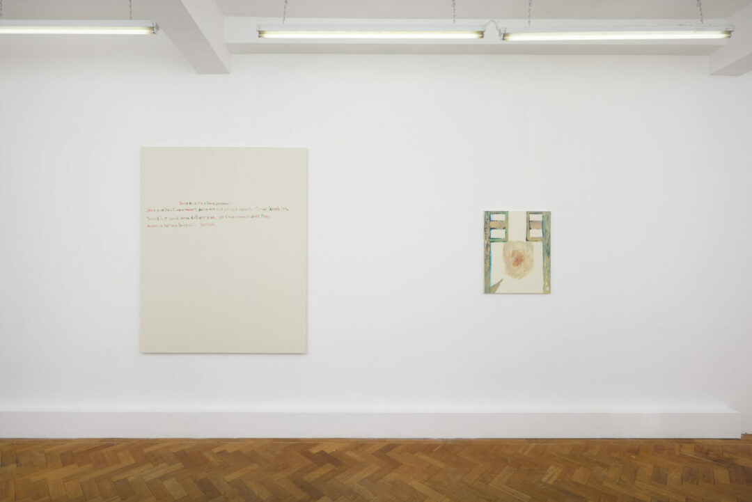 Le goût distinct pour la phraséologie se manifeste dès le titre de l’exposition de Kazuki Matsushita co-présentée par Arcadia Missa et Kayokoyuki (Japon). « Bear’s anus like a X’mas ornament »associe des motifs aussi différents que l’ours (en référence au problème actuel nippon de surpopulation oursonne), son anus et les décorations de noël. Tenant lieu d’introduction ou de synthèse, sur un canevas laissé brut et dans une écriture incertaine, l’ensemble des titres de la série de peintures sont transcrits. La logique d’exposition par laquelle le titre fait la peinture en découle. En effet, les mots, empruntés dans la littérature usuelle sont, par des jeux anagrammés qui les étirent et les déforment, des catalyseurs d’images. Traduit en des paysages abstraits aux couleurs voilées dans lesquels les espaces de réserves opèrent aussi librement que le reste des gestes picturaux, la pratique de Katzuki acère la porosité entre signe et signifié.