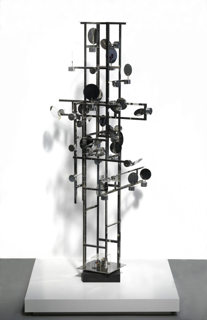 Acier inoxydable, miroirs, moteurs, combinateurs, plateau tournant, circuit électrique, 308 x 125 x 130 cm. Centre Pompidou, Paris, Musée national d’art moderne – Centre de création industrielle. Photo © Centre Pompidou, MNAM-CCI, Dist. RMN-GP / Philippe Migeat © Adagp, Paris, 2025