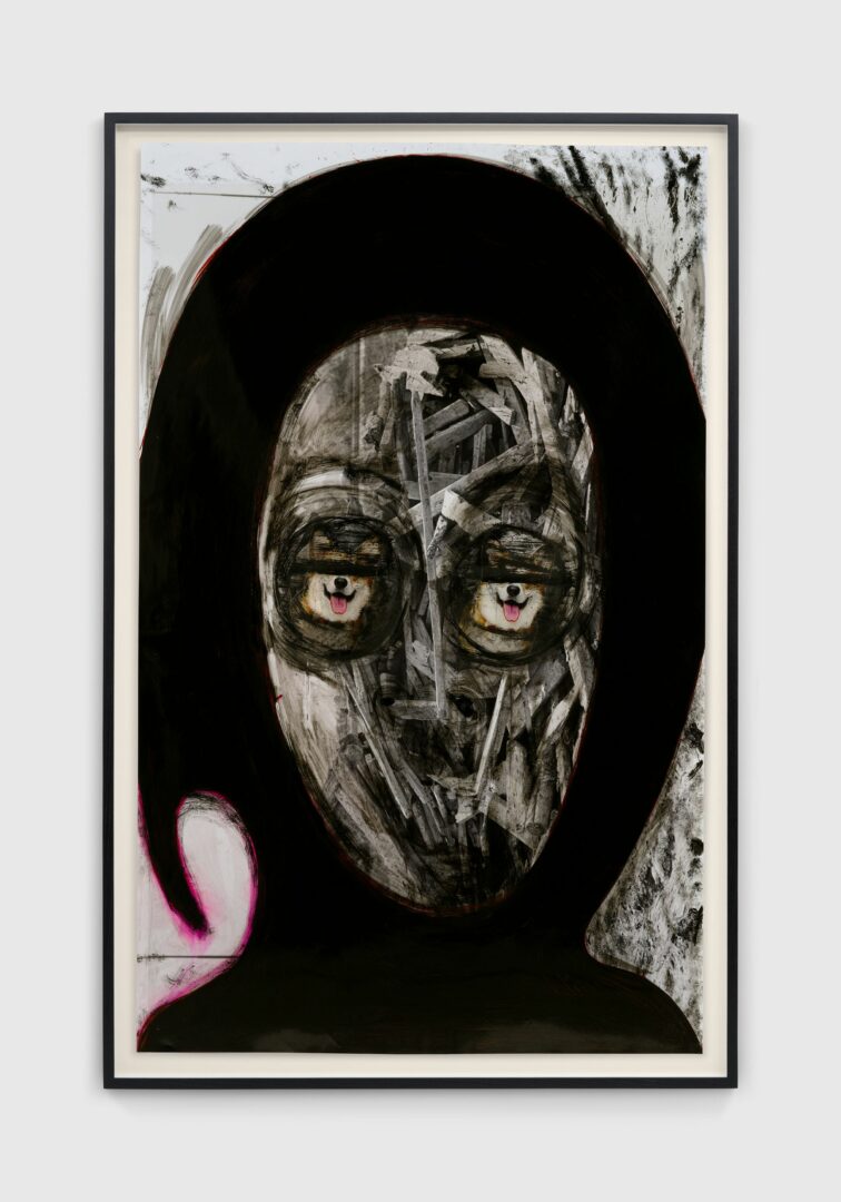 Autour des sculptures, les photo-dessins de Huma Bhabha construisent un autre type de présence. Réalisées à partir de photographies personnelles prises à Karachi, ces images deviennent le support d’interventions graphiques : encre, pastel, collage. Les visages y apparaissent de manière fragmentaire, souvent réduits à des yeux cerclés de noir, incrustés sur un fond photographique. Il s’agit de constructions composites, hybrides, qui tiennent du masque autant que du regard. Et l’on s’aperçoit que ce dernier est bien un regard « animal » car ce sont des images de son chien, un Welsh Corgi Pembroke, qui sont positionnées en correspondance des yeux.