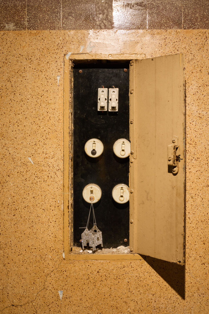 On s’y engage, et on voit une amulette briller à l’endroit d’un tableau d’interrupteurs. C’est une maison sans toit qui flotte au-dessus d’un paysage de poussières intactes depuis des années (ici c’est chez toi, 2025). En avançant, on trouve d’autres formes de maisons béantes ou creusées, ouvertes à tous les vents, étroitement emballées d’un tulle délicat et de cuirs usagés. L’artiste dessine leurs squelettes à partir de bris de céramique rassemblés et emballés, reliques d’un foyer placées en regard des motifs des carreaux de céramique qui ornent le couloir des cellules et des dortoirs.