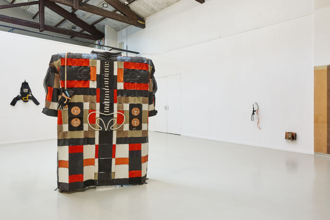 Et seul, au centre de l’espace, un grand manteau-cabane (a body – a house, 2025). On y a cousu par l’extérieur les os de la colonne heurtée, les os du bassin et des hanches opérées, emmaillotés en blanc. Les phalanges cousues par-dessus les gants de motos suspendus de part et d’autre de l’épaule – emmaillotées en blanc. L’artiste dit de ce manteau qu’il est le corps brisé, réparé et géant de sa maman. On y voit une ultime armure façonnée de rebuts et de secrets, assez grande pour contenir toutes les autres ; assez grande pour les avoir engendrées.