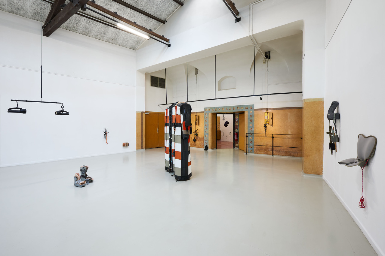 Pas à pas, on poursuit notre armement à l’entrée d’un couloir abritant les anciennes cellules et dortoirs. Jot Fau intervient à l’endroit des seuils, en choisissant de laisser toutes les portes fermées. Sur des manettes extérieures à la cellule – pour en contrôler l’ouverture des fenêtres –, deux lampes sont posées comme des gants de boxe prêts à être chaussés (un regard éclairé, 2025). En face, des colliers de verrous et de clés (les pendants de, 2025). Leurs tintements sont étouffés par l’enveloppe de cuir noir qui épouse leurs formes et couvre d’une même peau rapiécée tous les objets présents dans l’exposition et toutes les vies qu’ils ont renfermées. Leur emmaillotement méthodique et leur alliance forment un portail magique qui bravent l’architecture panacoustique.