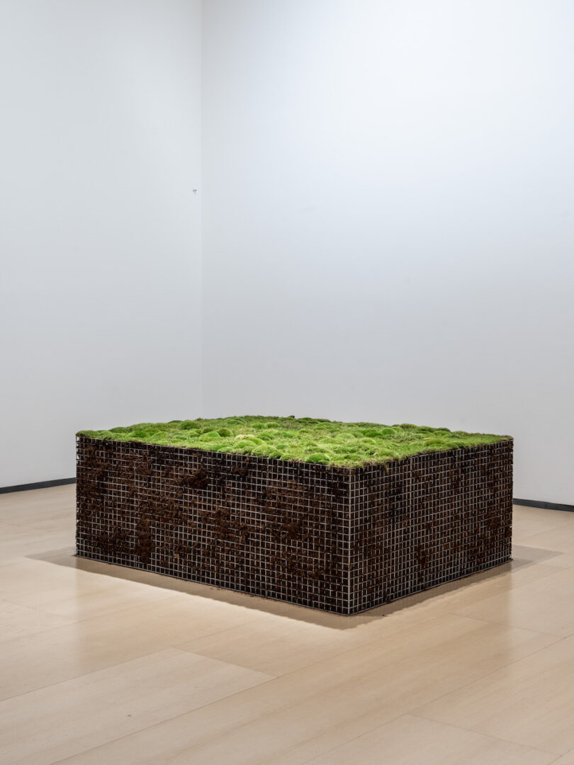 Meg Webster, Volume pour une position allongée (Volume for Lying Flat, 2016), tourbe, mousse verte, terre, grillage en acier galvanisé, 55,9 x 149,9 x 207 cm, avec l’aimable autorisation de l’artiste et de la Paula Cooper Gallery, New York. © Meg Webster, Bilbao, 2025
