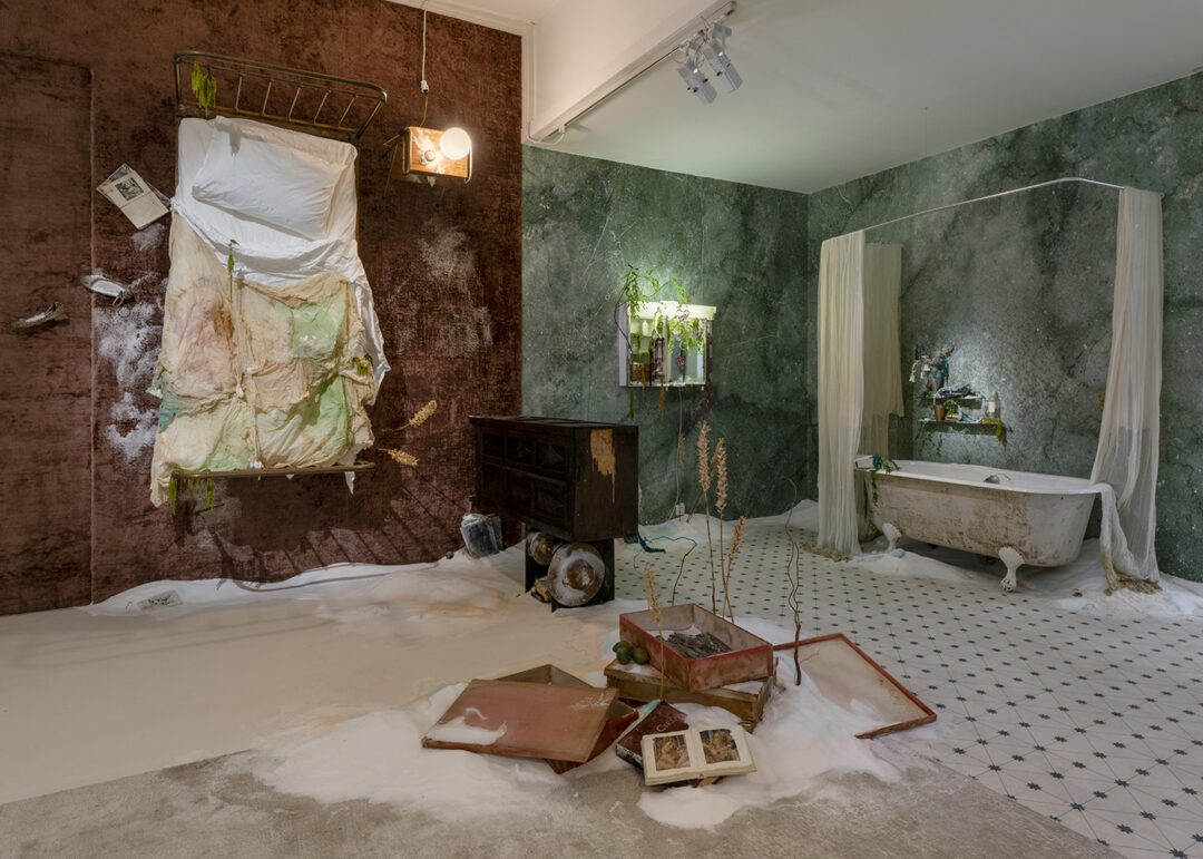Là où Lionel Sabatté tente de recomposer ce que le monde défait, Bianca Bondi (Galerie Mor Charpentier) choisit d’en suspendre les effets. Son installation Silent House nous plonge dans un espace domestique, tout droit tiré d’un conte de fée. Tout semble recouvert d’une épaisse couche de neige, d’une moisissure blanche. On imagine Cendrillon couchée là. Il s’agit de sel en réalité – omniprésent dans le travail de l’artiste – utilisé depuis la préhistoire pour conserver les aliments. Mais ici, nulle viande, nulle chair, seulement des objets, des bibelots.