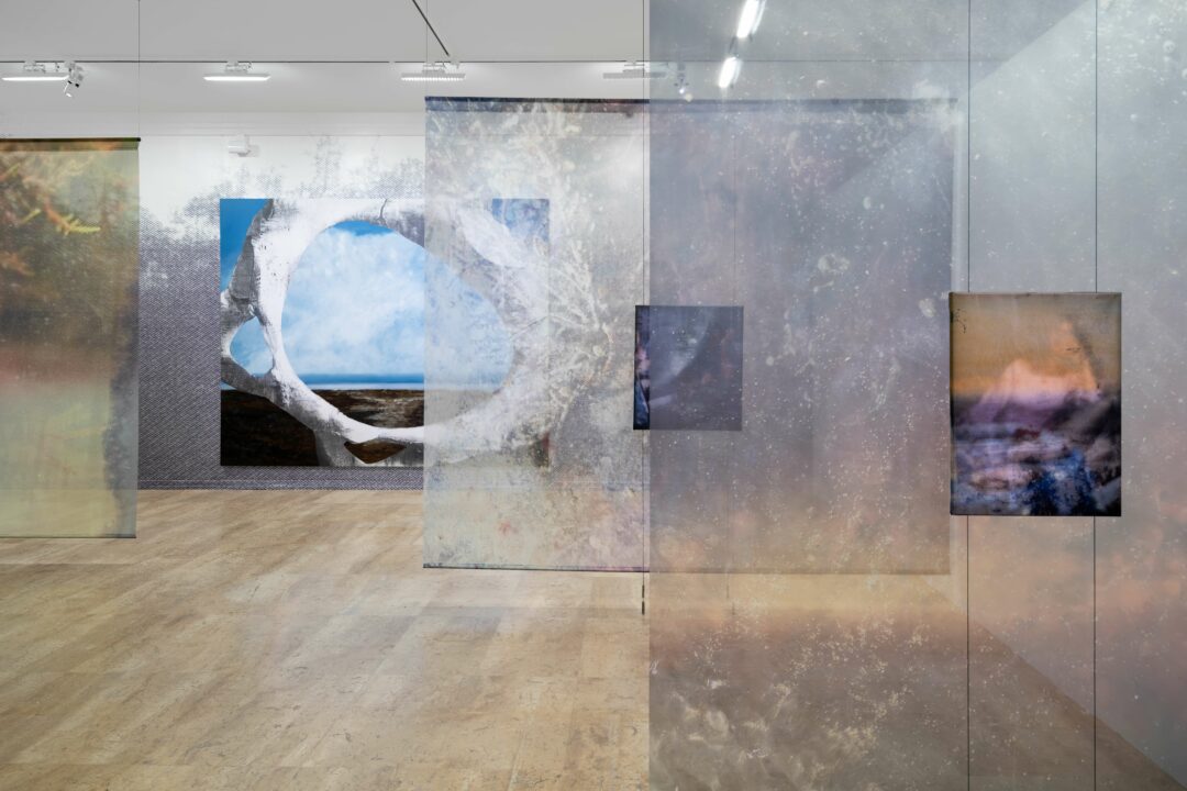 L’architecture fait office de seuil, de main tendue : escaliers, portes et passages au premier plan débouchent sur des paysages et ciels primaires, proches d’une aube de l’humanité. Des photographies de marais en érosion sont imprimées sur de grands voiles transparents. Suspendues, elles évoquent tantôt une carte du ciel, tantôt une observation microscopique, un monde qui transcende les échelles. La superposition des échelles d’ailleurs – du géologique au stellaire, du petit détail aux grands tissus – contribue à brouiller la lecture.