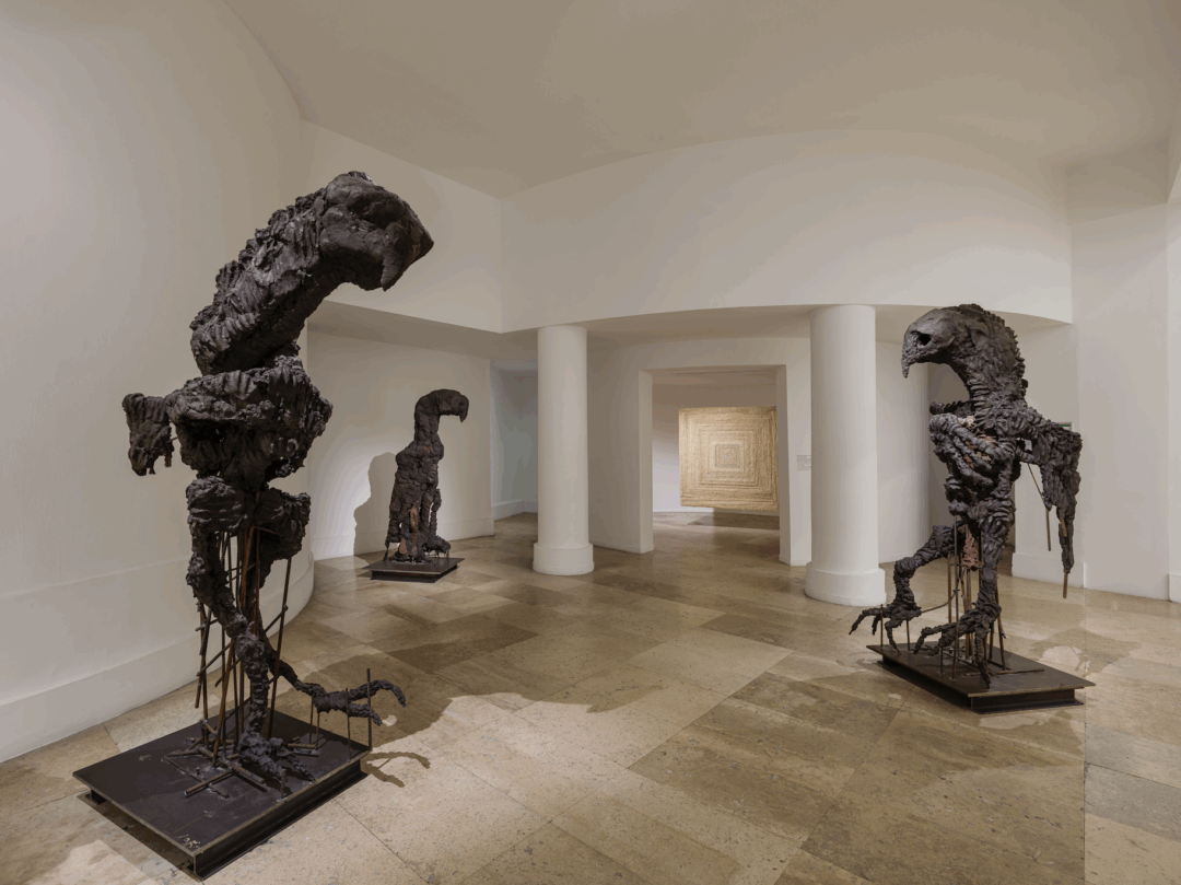 Lionel Sabatté (Galerie Ceysson & Bénétière) recompose ce qui s’effrite, utilise ce qui est délaissé, rend visible l’invisible, allant à rebours d’un monde qui jette et abandonne. Cette attitude face à la matière, position vis-à-vis du monde, vibre avec force dans sa proposition Interfaces mouvantes, aperçu de son très vaste univers, qui occupe les dernières pièces de l’exposition. De grands oiseaux massifs et archaïques, façonnés à partir de pouzzolane – roche volcanique poreuse utilisée dans le jardinage – nous accueillent. Ils évoquent à la fois les prises de son grand-père chasseur et les créatures mythologiques des épopées fantastiques. Nés de ce minéral friable mais incombustible, imputrescible, ces oiseaux passent du « chaos au cosmos » (Eliade, Mythe de l’éternel retour, 1949), soit du désordre à l’ordre, de l’éphémère à la permanence. Des phénix sortis de la cendre, perchés sur des tiges de métal rouillées.